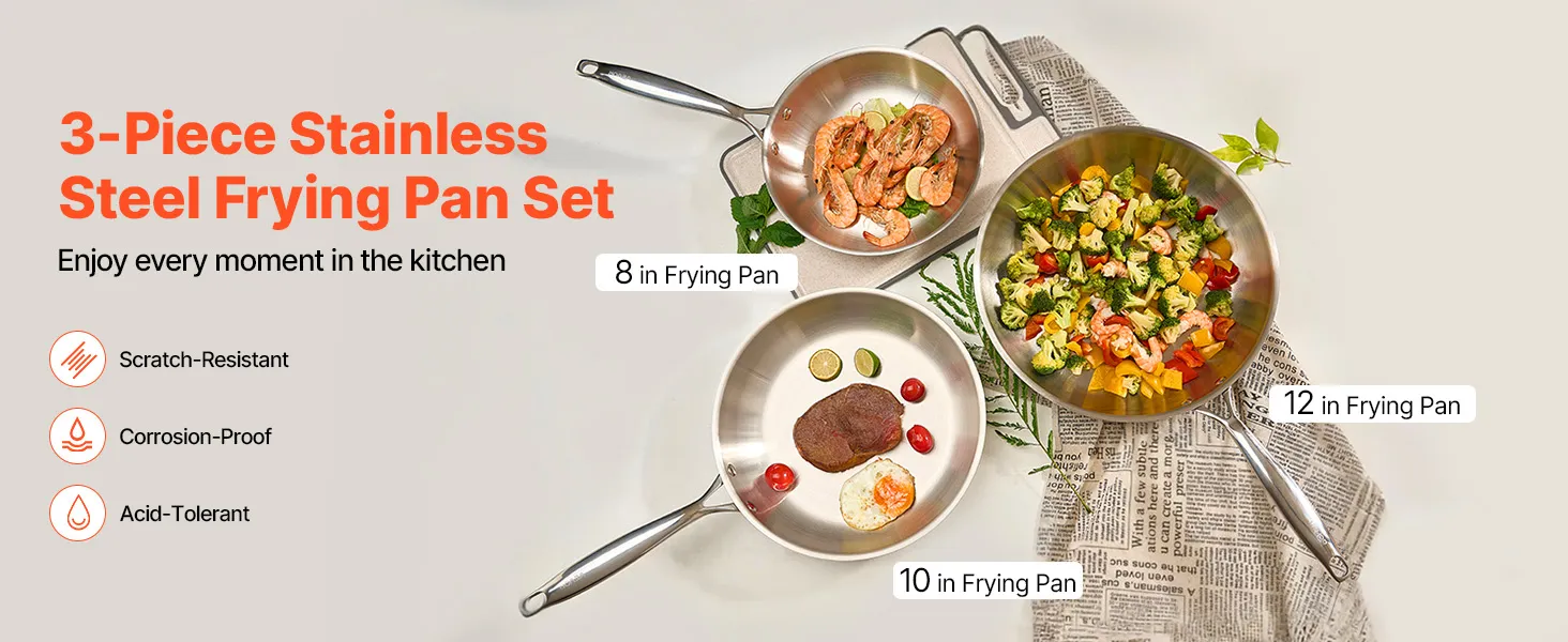 Cook Like a Pro: This frying pan set includes 8, 10, 12 inch pans, crafted with triple-layer stainless steel for excellent heat retention and even cooking. Ergonomic design meets performance, locking in flavor and nutrients with every meal