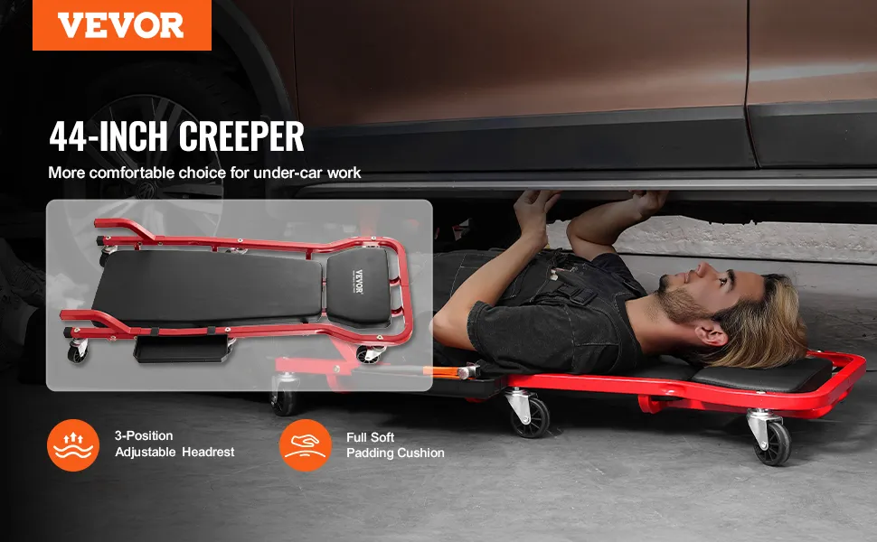 Featuring a 3-position headrest adjustment and a convenient rear handle, this 44-inch garage creeper with wheels ensures comfort for automotive professionals working under vehicles. With a 300 lb load capacity, steel frame, soft padding, and tool tray, it provides stable and comfortable support.