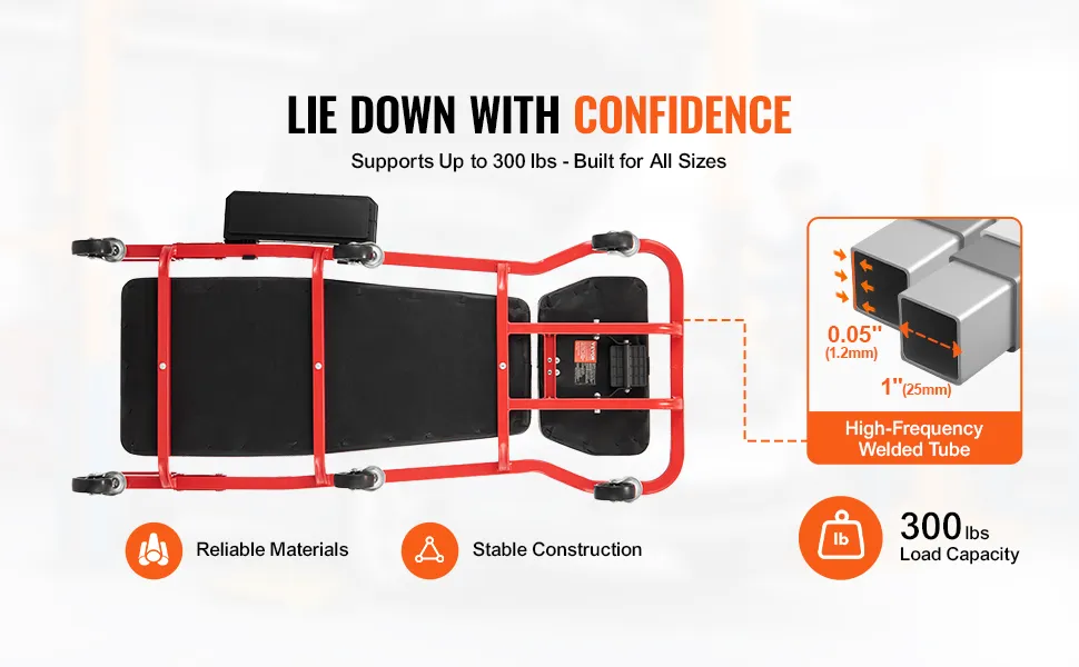 Sturdy & Durable: Able to support up to 300 lbs / 136.1 kg, this automotive creeper is built for reliability. Made from high-strength carbon structural steel, it offers excellent strength and rigidity, with secure welding to avoid breakage. The steel frame maintains its shape and stability under load, resisting bending and tilting.
