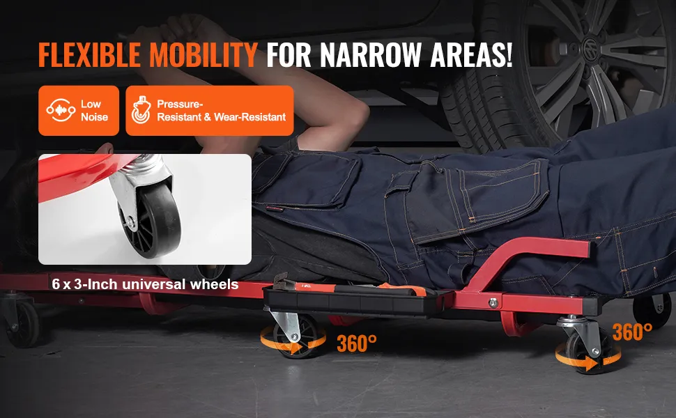 With a low ground clearance and six swivel casters, this automotive creeper glides smoothly in tight spaces. Easily maneuver in any direction, whether side to side or forward and back, without strain.