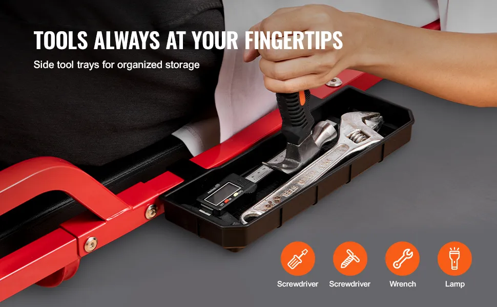 Side Tool Trays: The automotive creeper comes with side-mounted tool trays for storing wrenches, screwdrivers, and bolts. It offers ample space and keeps your tools within easy reach, avoiding the need to get up or move around to retrieve them.