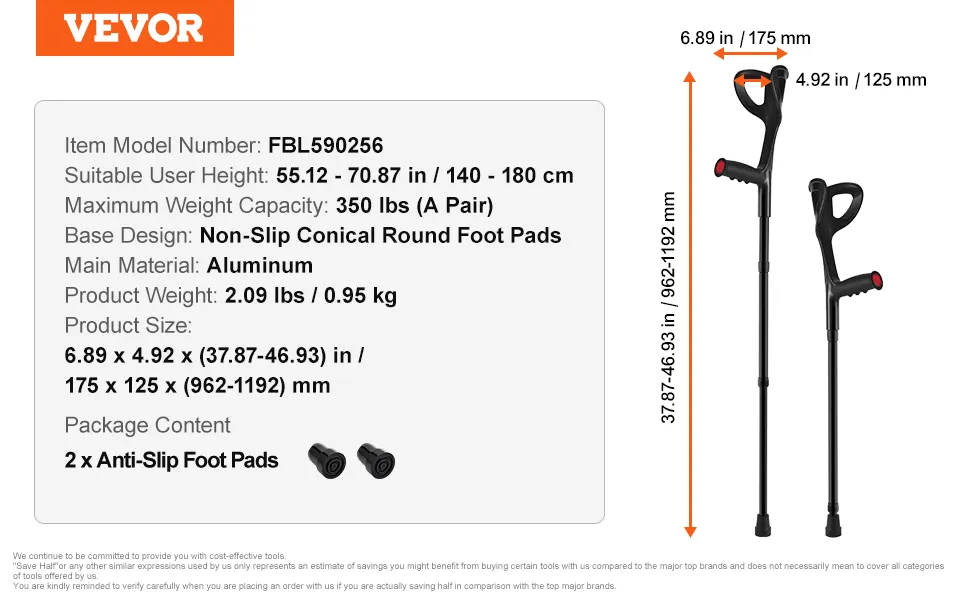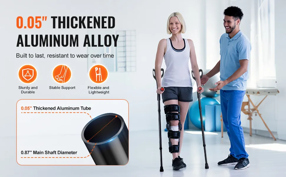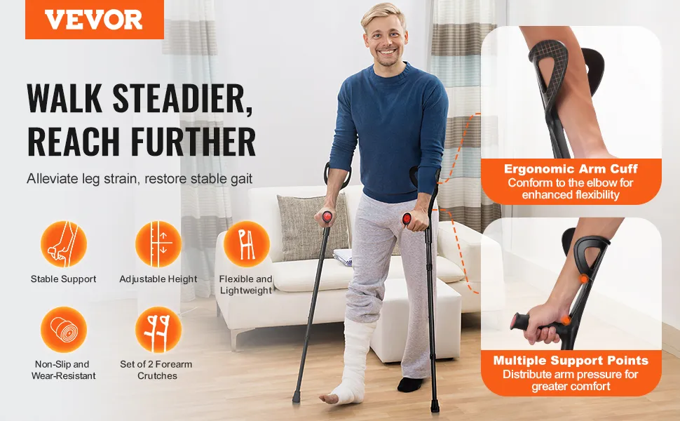 Reliable Walking Partner: VEVOR forearm crutches, crafted from durable aluminum alloy, support up to 350 lbs, ensuring stability and safety. Ideal for leg injuries, elderly, disabled, or post-surgical, alleviating your leg strain and restoring stable gait