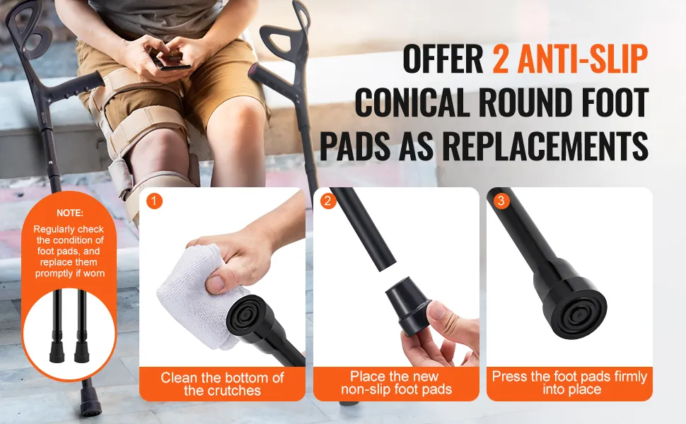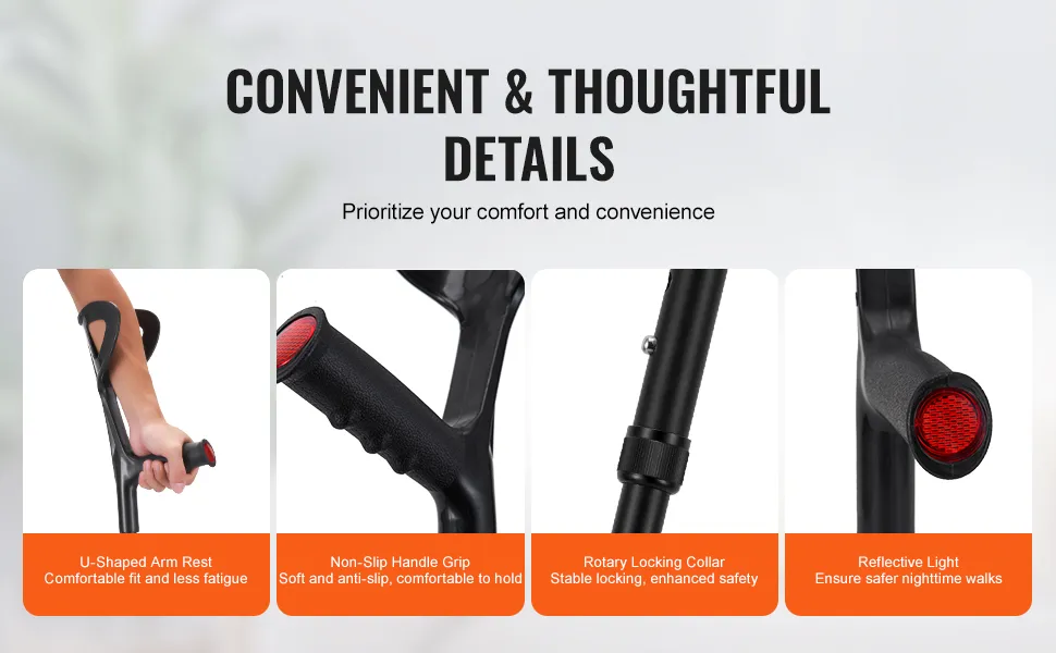 Relieve leg strain and walk with steadiness: Empower your mobility with VEVOR forearm crutches. Combining robust strength, unparalleled comfort, and 10-level adjustable height, they offer exceptional support and stability. Experience a safer and more confident walking journey with every step.