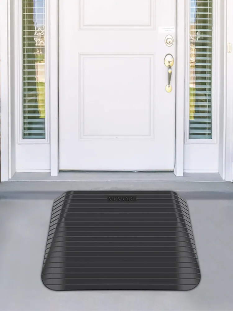 The 4" rise transitions modular entry ramp for doorways is up to 2200 lbs load capacity. All recycled rubber construction, a grooved slip-proof surface, beveled edges, and no-tool assemble for the stably and securely pass by wheelchairs, scooters, walkers, and motors. Household cars to pass through are also acceptable.