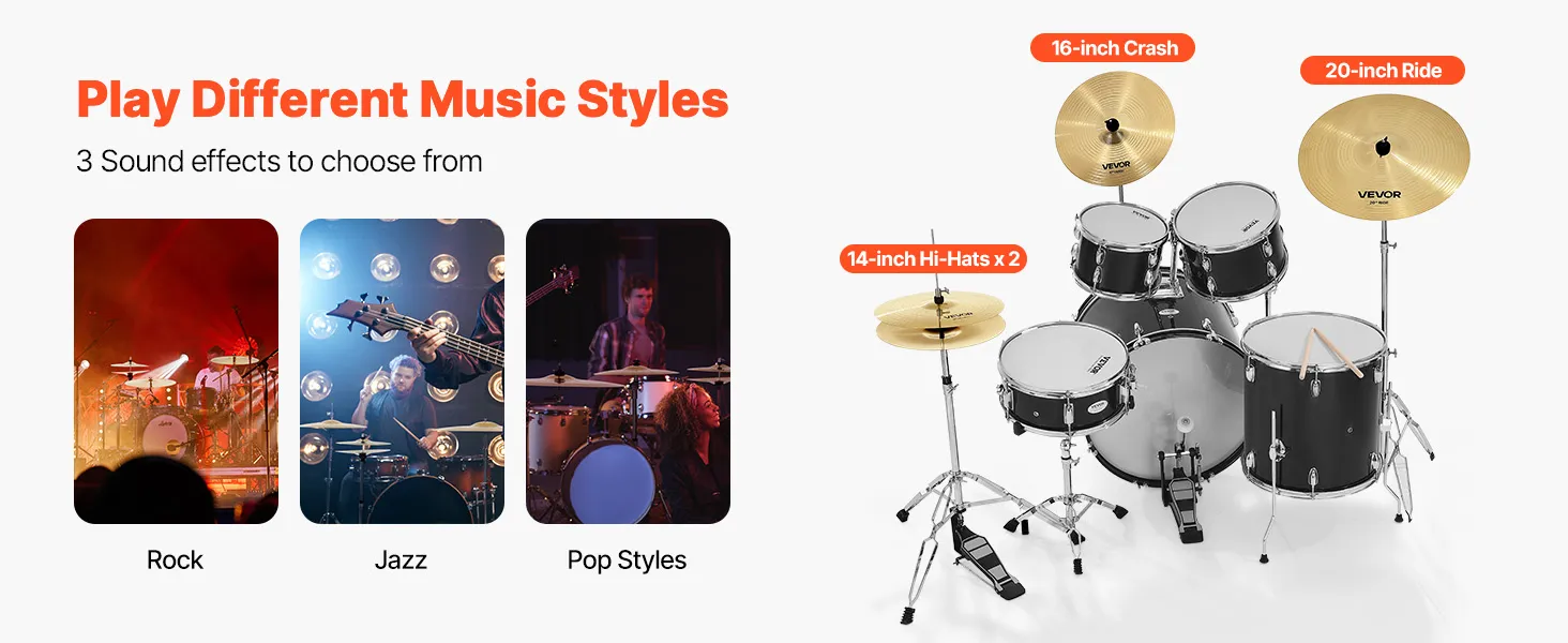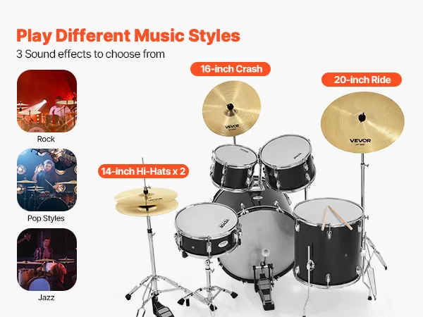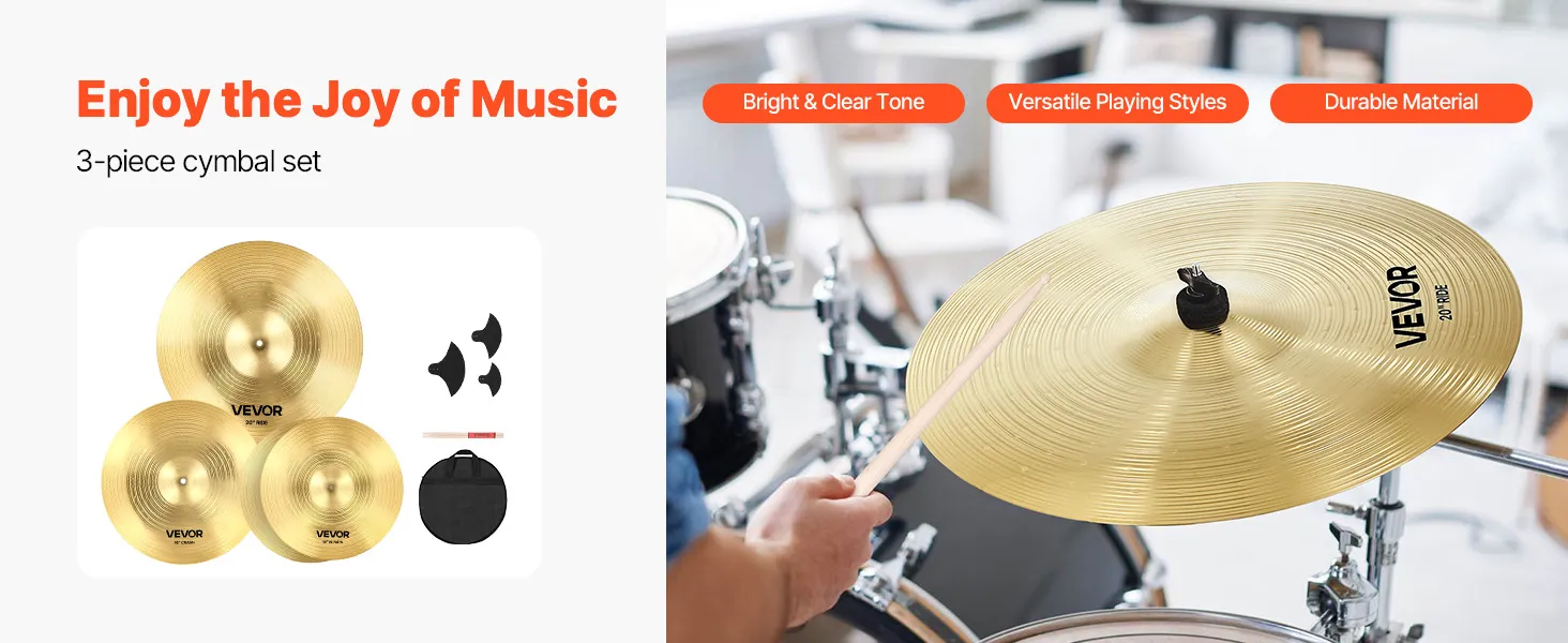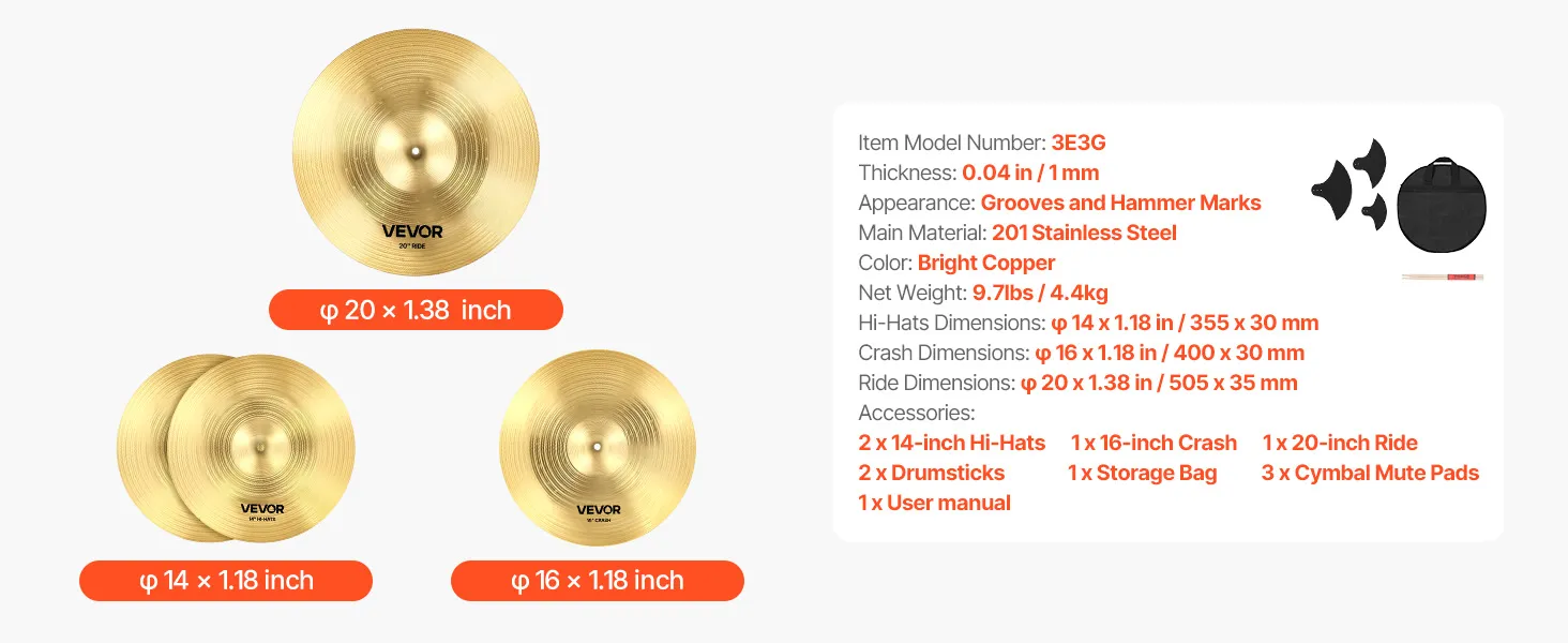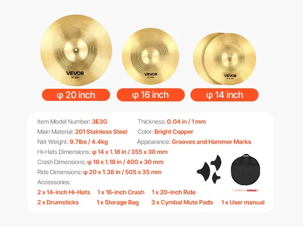Multi-piece Cymbal Set: This cymbal set includes 14-inch Hi-Hats, 16-inch Crash, and 20-inch Ride, providing versatile sounds for all your musical needs. Ideal for jazz, rock, or pop, it suits every style