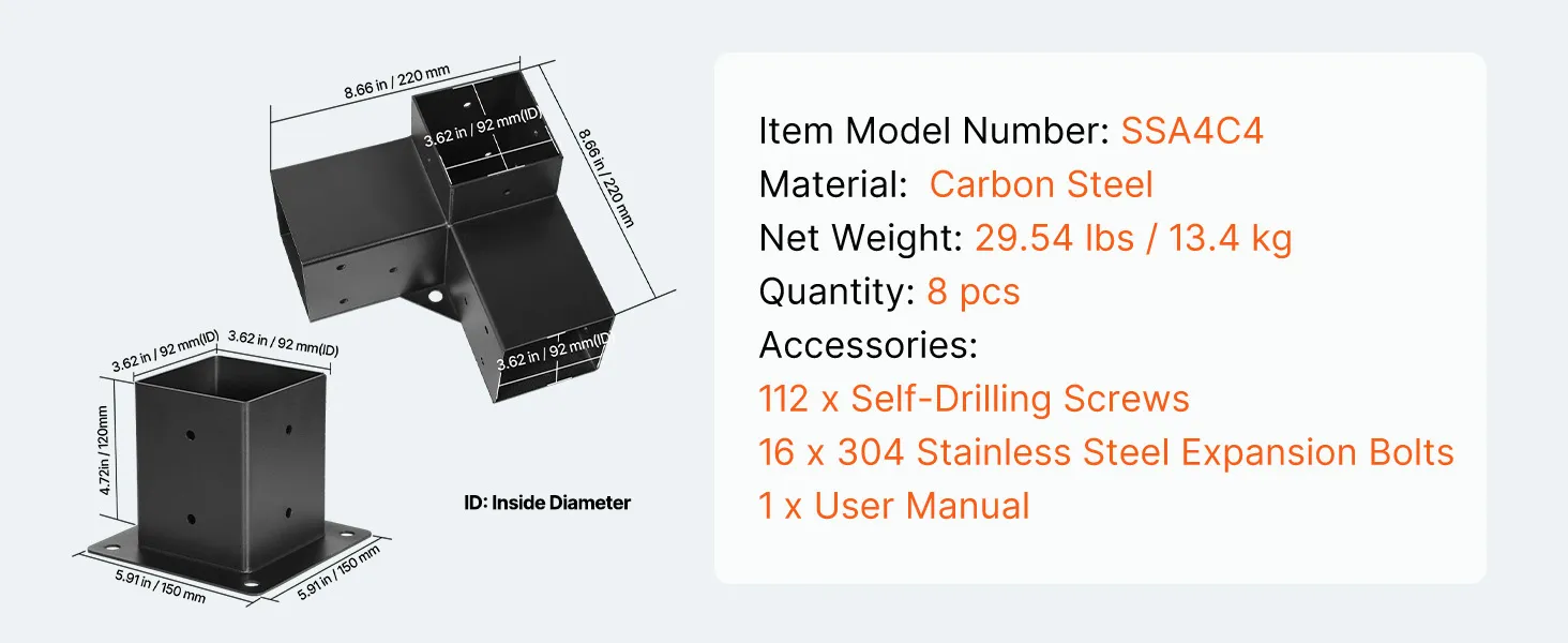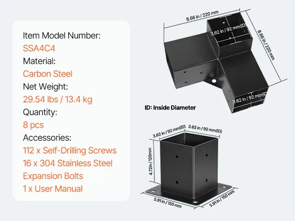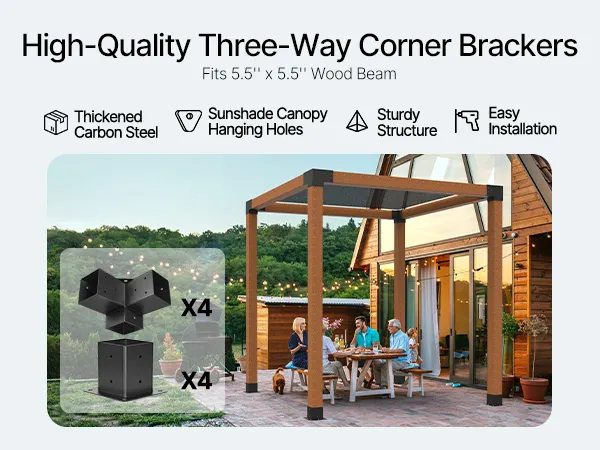 4 x 4 Inch Three-Way Pergola Brackets: This durable and strong pergola bracket kit that covers wooden beams, preventing them from rotting due to rainwater and harsh sunlight. It is designed for the mainstream 4 x 4 Inch specifications and can accommodate actual dimensions of 3.5 x 3.5 inches (92 x 92 mm) for both soft and hardwood