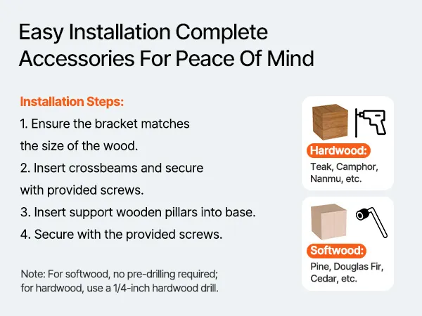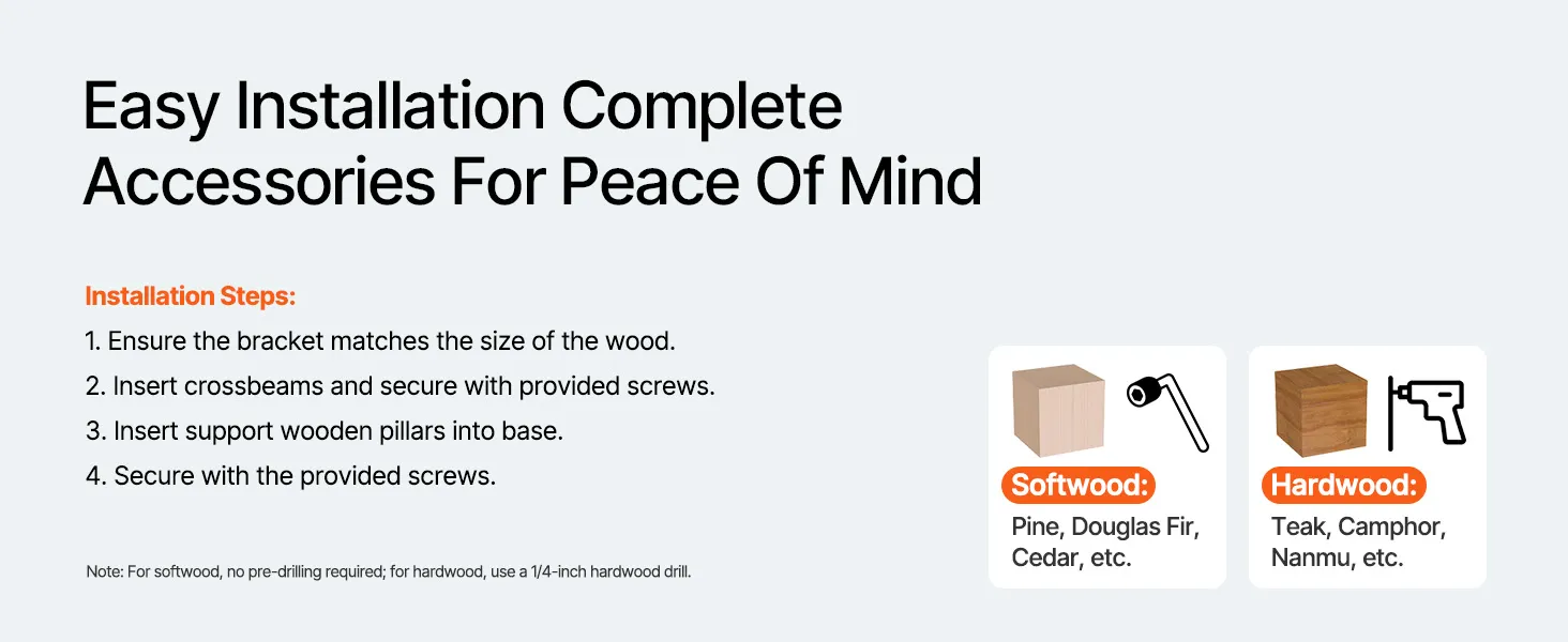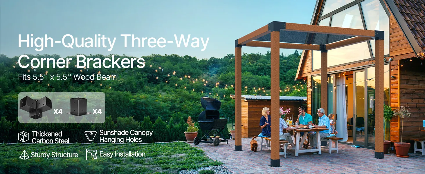 Complete Accessories, Easy Installation: The pergola kit includes 4 x 3-way corner brackets, 4 x post base brackets, and all screws. Cut the wood, insert it into the brackets, tighten, and secure the posts into the base plates. Quick, simple assembly is easy for anyone