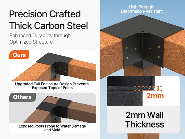 Crafted from 2mm thick carbon steel plates, these brackets are coated to resist corrosion and rust. The 90° boot structure prevents breakage and deformation. The upgraded full-coverage design shields the top of the columns from rainwater exposure.