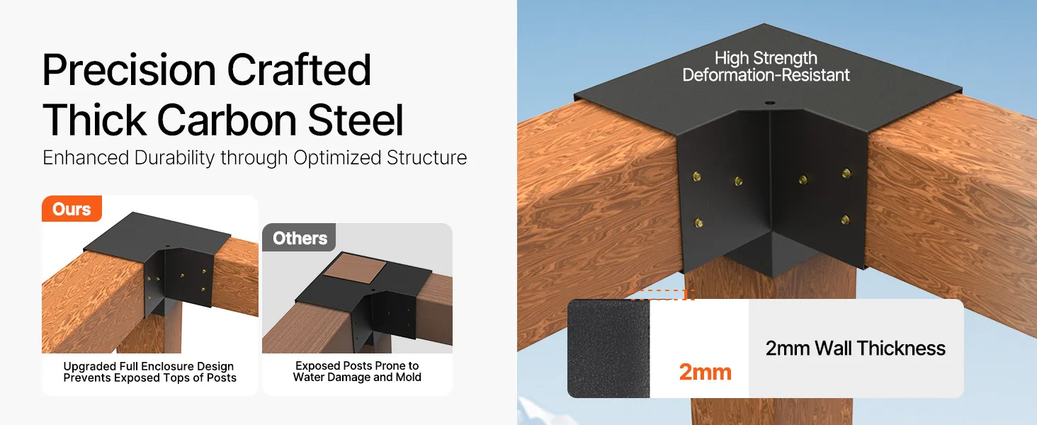 Enhanced Durability: This pergola hardware is built from 2 mm carbon steel with a black powder coating for corrosion resistance. The reinforced 90° boot structure avoids breakage and deformation, while the full-coverage design shields posts from rain. Integrated drainage holes also help extend lifespan