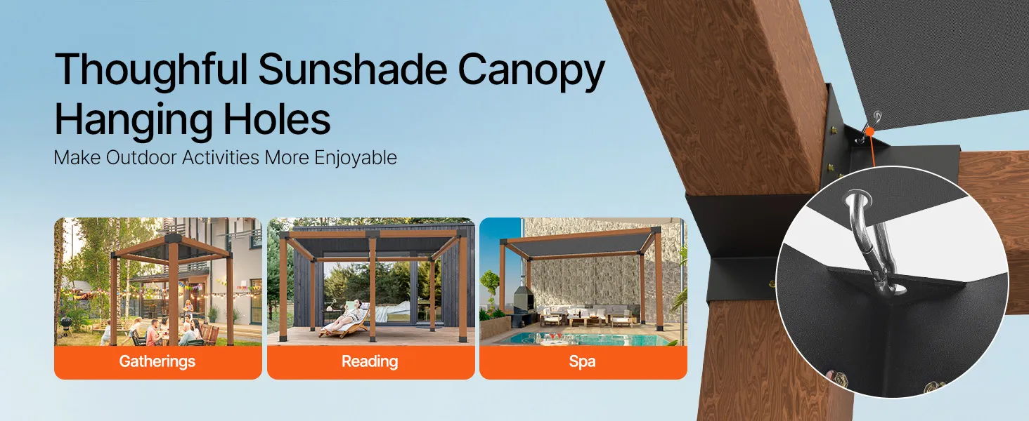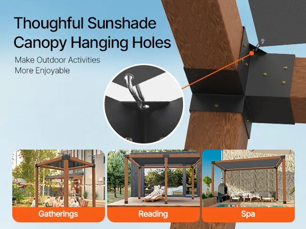 Sunshade Sail Hanging Hole: The 4x4 pergola kit includes brackets with built-in holes to hang a canvas sunshade sail that blocks direct sunlight and rain, keeping the interior dry and comfortable. The design also allows easy removal for cleaning and maintenance