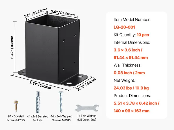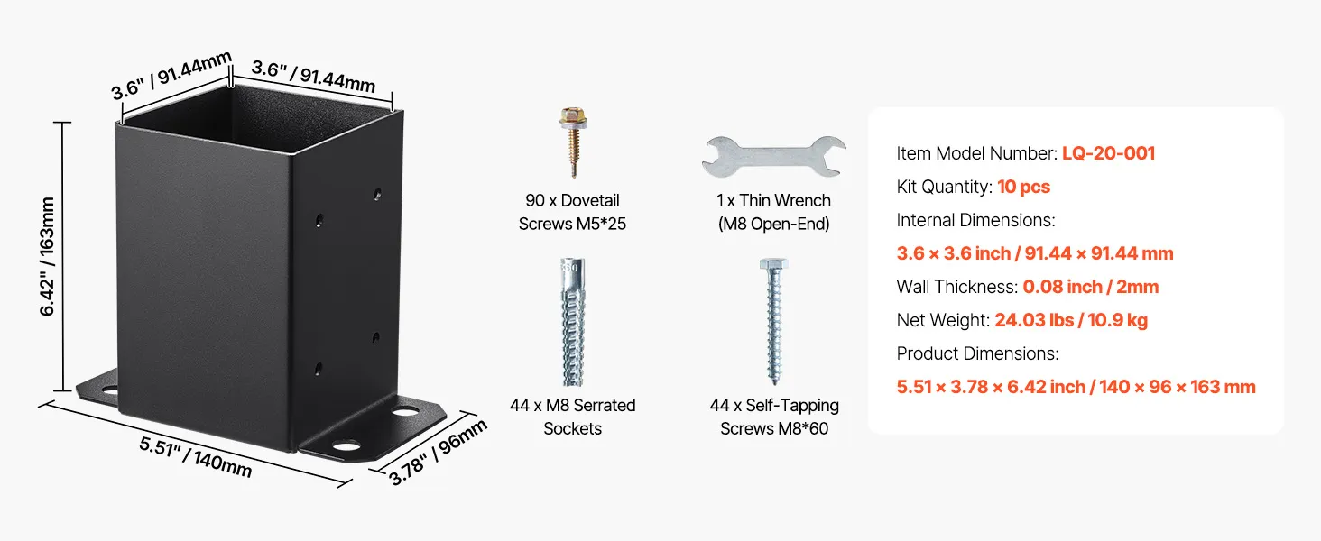 Complete Accessories: This post anchor base set includes: Dovetail Screws M5x25 (90 pcs), Thin Wrench M8 Open-End 14 (1 pc), Serrated Sleeves M8 (44 pcs), and Self-Tapping Screws M8x60 (44 pcs). Easy to install and convenient to use