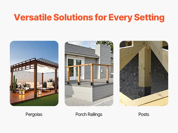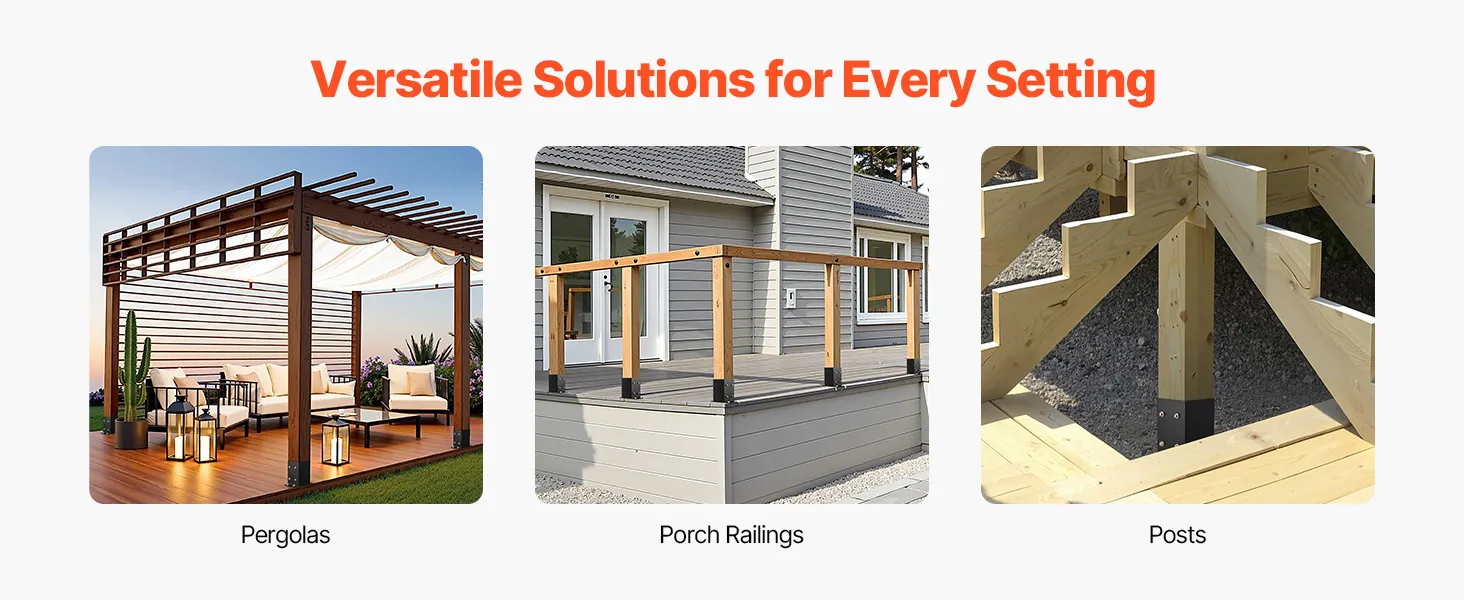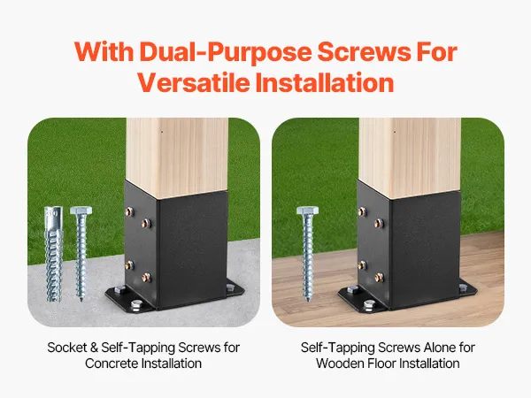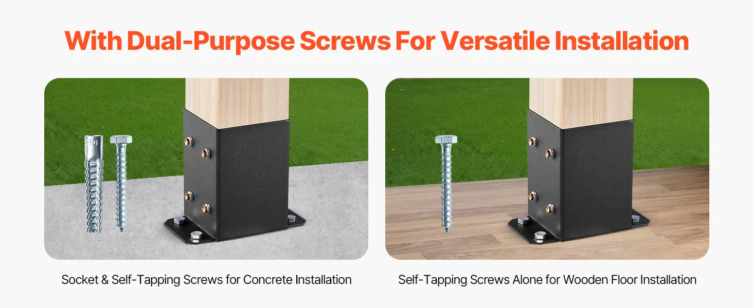 Wide Application: The dual-purpose screws are suitable for both concrete and wooden floor installations. This post base can be widely used in pergolas, porch railings, column supports, and more, providing secure support