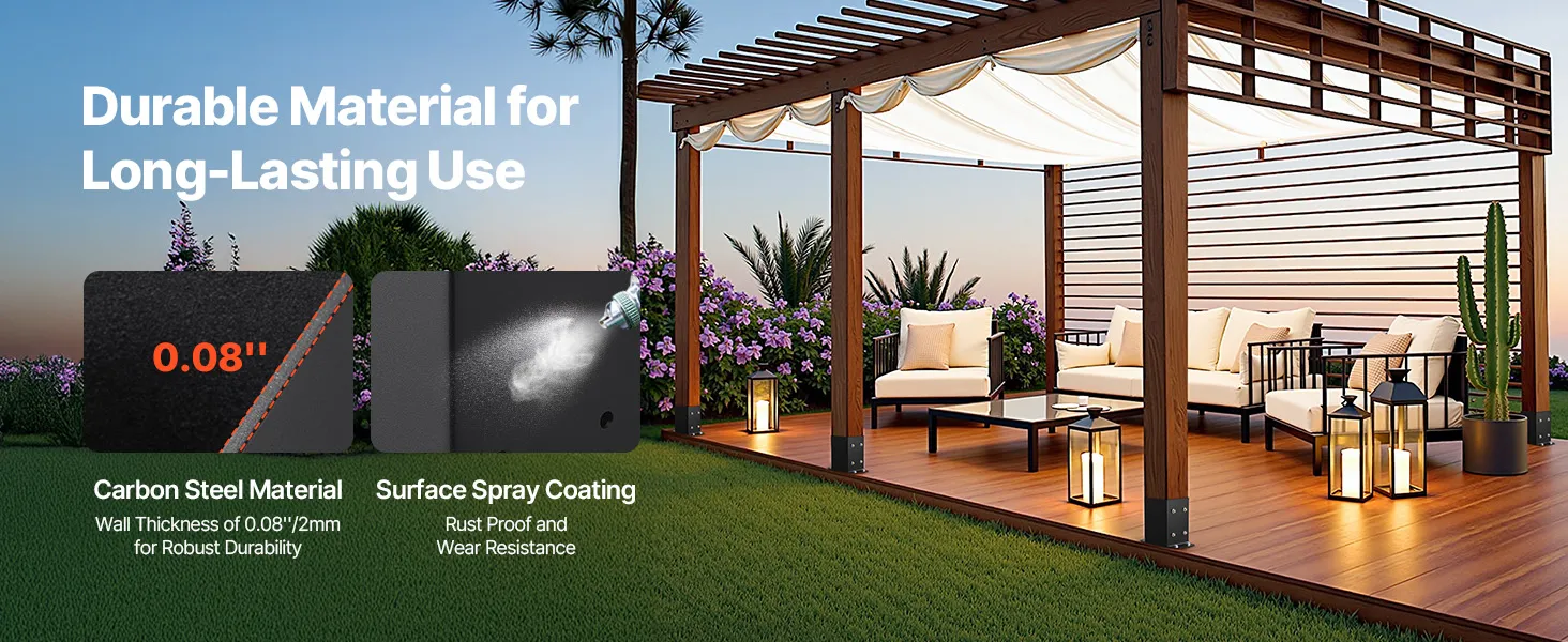 The post base is made of sturdy carbon steel, offering durability and resistance to rust and wear. It provides stable support and comes with dual-purpose screws, making installation easy on both concrete and wooden floors. It is ideal for fixed installations in pergolas, porch railings, and more.