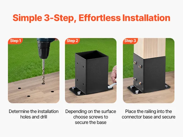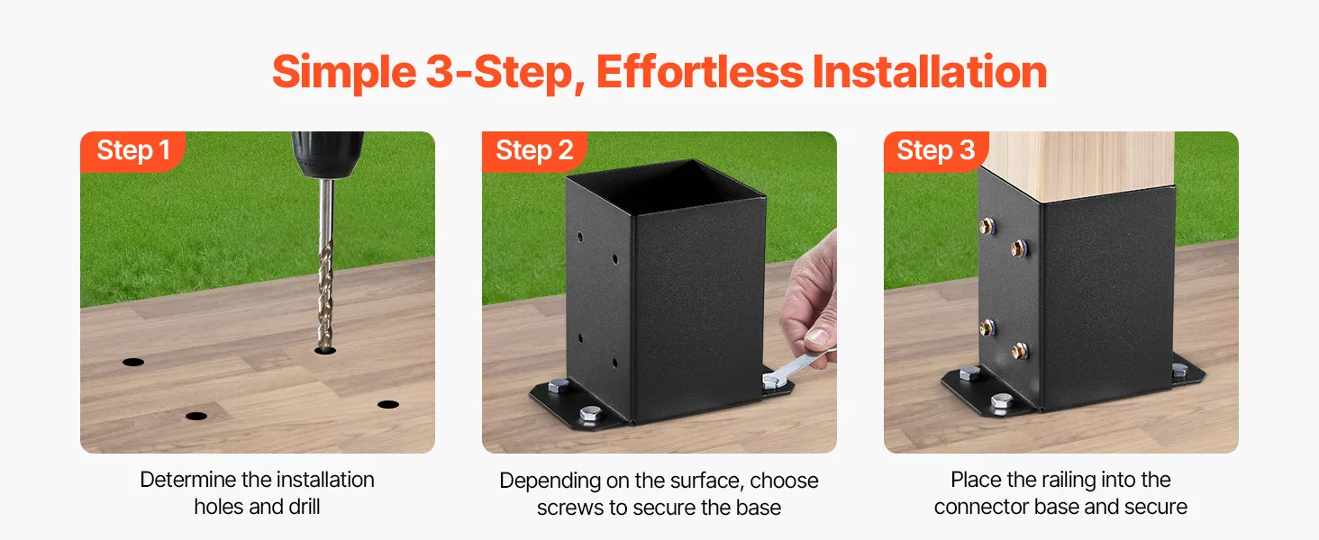 Using a power drill to create holes, our deck post base features screw holes for easy installation with screws, making assembly simple.