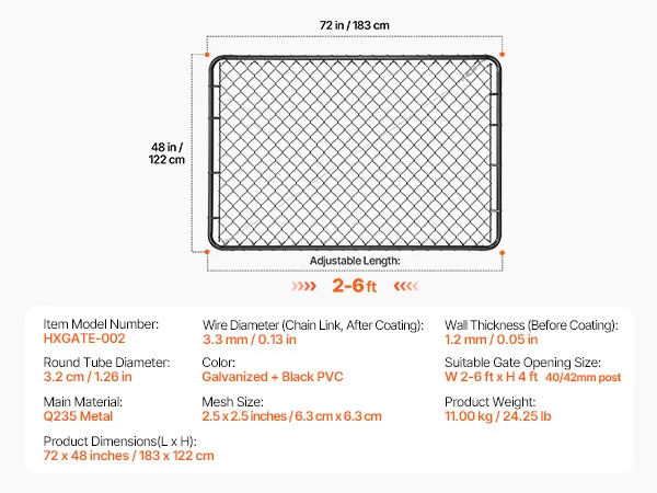 VEVOR Chain Link Fence Gate, 72 x 48 in, Adjustable Chain Link Fence Panel, Fit 2.2-6 ft (W) x 6 ft (H) Garden Fence Gate Opening, Fencing Gate with Plastic Coating, for Farm Black, Posts Not Included