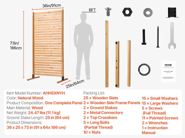 Durable and Stable Construction: Made with wooden panels and stainless steel bolts, this outdoor privacy screen features a 25-inch ground support for superior stability. The stainless steel bolts ensure it won’t easily rust or deform, even with prolonged outdoor exposure, and the sturdy design prevents tipping in windy conditions.