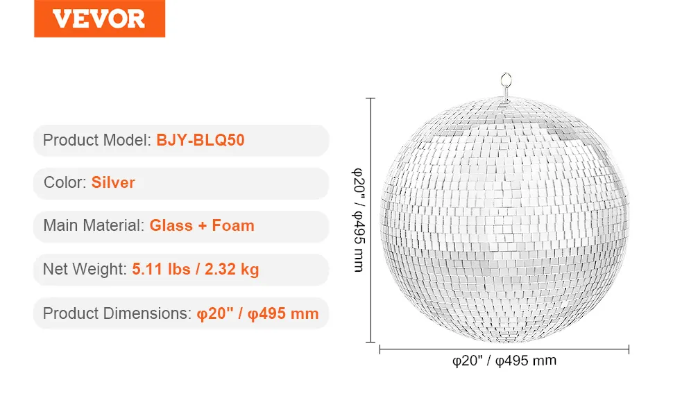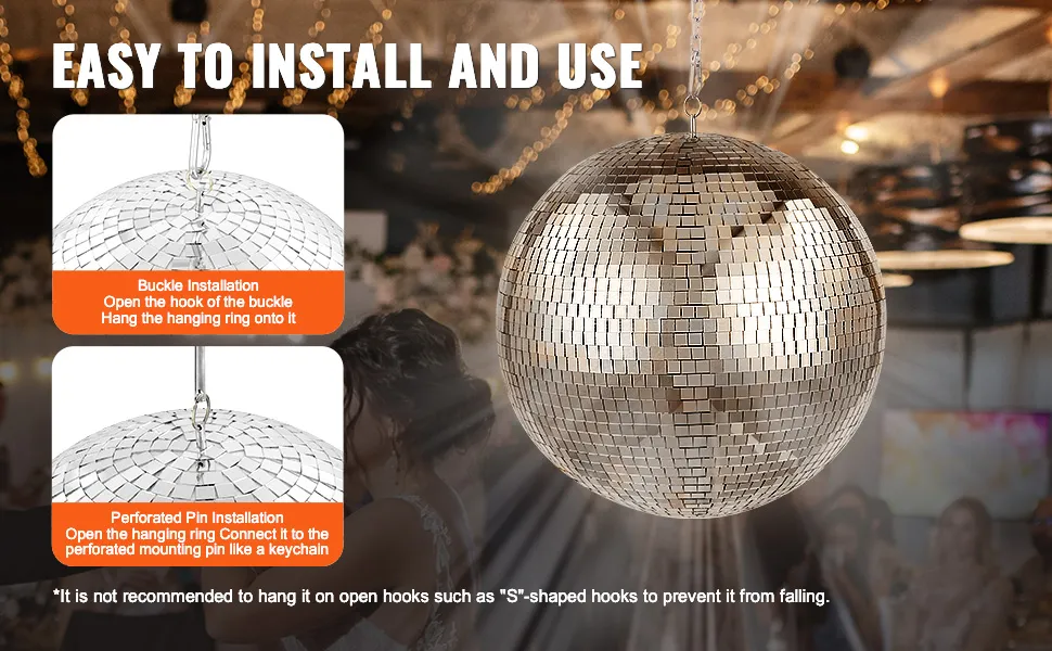 Easy Installation: Our 20 in/495 mm party mirror ball comes with a pre-installed O ring on the top of the ball, which provides a secure and safe hanging to prevent balls from falling and causing damages. It can be easily hang on any ceiling walls with a hook, or electronic rotating motor (Sold/Purchase Separately)—no hassle, just fun!