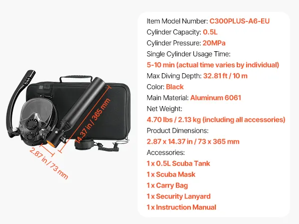Flexible Breathing System: This 0.5L mini diving kit is your ideal companion for emergency rescues, backup air, and leisure diving. Breathe fresh air above the water and dive into the depths to enjoy 5-10 minutes of underwater breathing (max depth: 32.81ft/10m). Ready when you are!
