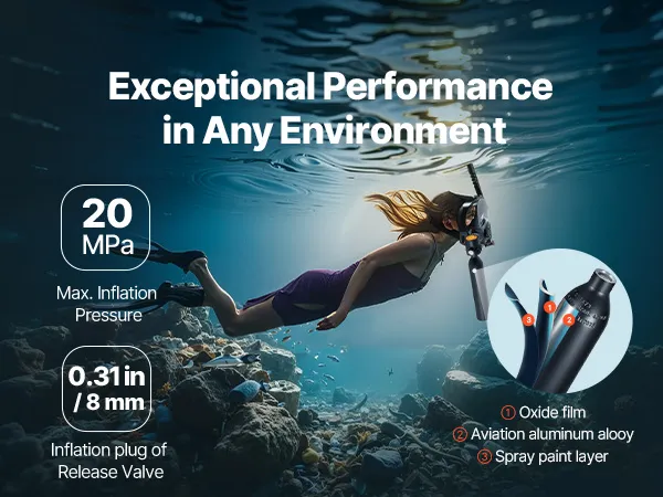 High Quality Construction: Built from aviation-grade aluminum, this portable scuba diving tank is pressure-resistant, corrosion-proof, and designed for long-term use. The food-grade silicone mouthpiece is crack-resistant, ensuring security during every dive. Max pressure: 20MPa. The inflation plug of release valve is 0.31 in / 8 mm.