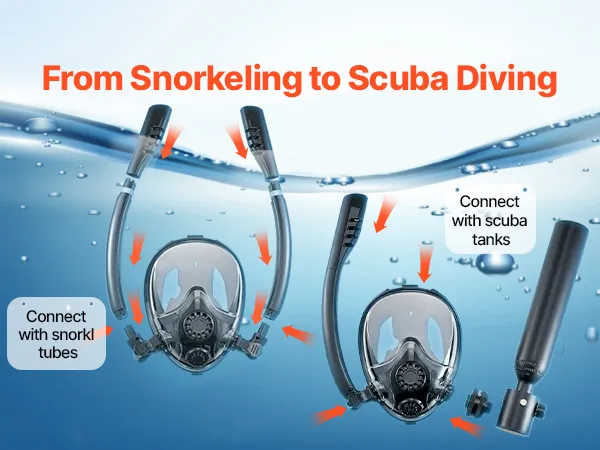Flexible Assembly: The mask includes two removable tubes for snorkeling. You can attach one to the tank for shallow or deep dives (max 32.81ft/10m). The refillable snorkel air tank can also be used as a backup air source, with a max depth of 98.43ft/30m. Ready for any underwater adventure!