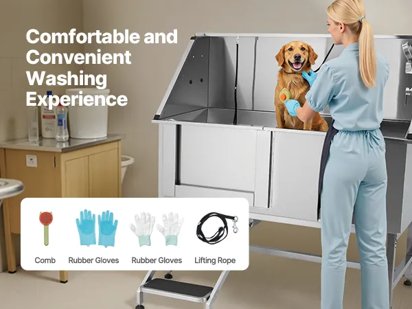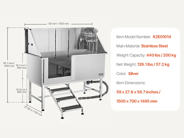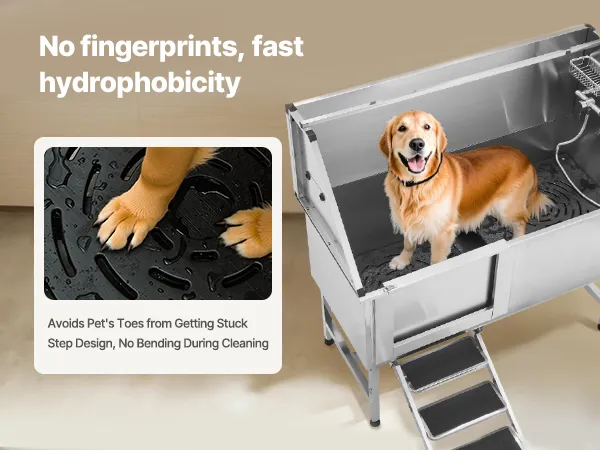 This tub ensures no water leakage. Made from stainless steel, it is corrosion-resistant and sturdy, maintaining its new look over time. The tub features smooth edges, ensuring security for both pets and users during bathing.