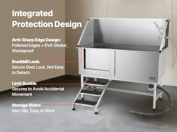 Integrated Design: The dog grooming tub is featuring hot and cold faucets, a dual-control showerhead, and a soap holder, this design makes pet bathing effortless and efficient. The PE water filter board provides a non-slip draining surface, while the included duckbill buckle stops pets from accidentally triggering the door during bath time, keeping them securely inside