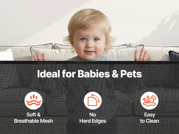 Secure Separation Without Blocking View: The retractable gate is crafted from high-strength baby-grade PVC mesh that's soft to the touch, breathable, and see-through, so you can monitor your baby or pet from a distance while creating a secure barrier