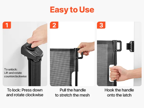 Easy One-Handed Operation: Designed for convenience, our mesh baby gate opens in one simple step using just one hand. No juggling items or struggling with locks. Get through quickly and smoothly, even while carrying groceries, a baby, or other items