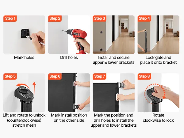 Damage-Free Baseboard Fit: Lower brackets can be adjusted vertically, allowing the retractable dog gate to be mounted over baseboards without damage. All hardware is included for quick and easy installation