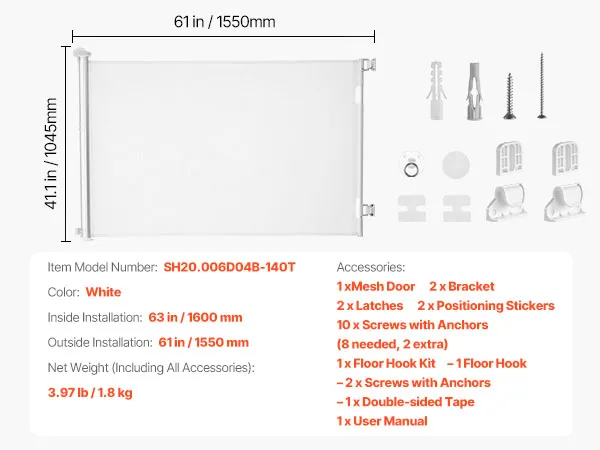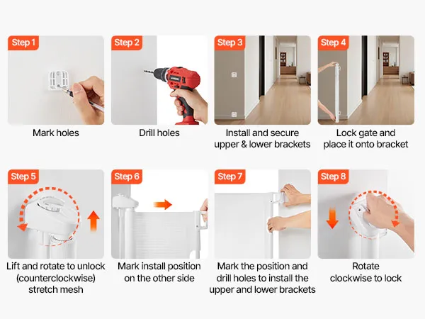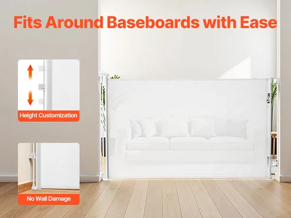 Damage-Free Baseboard Fit: Lower brackets can be adjusted vertically, allowing the retractable dog gate to be mounted over baseboards without damage. All hardware is included for quick and easy installation