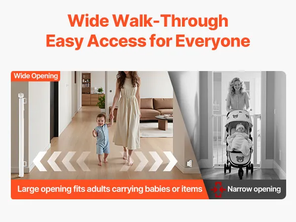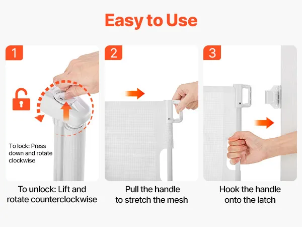 Easy One-Handed Operation: Designed for convenience, our mesh baby gate opens in one simple step using just one hand. No juggling items or struggling with locks. Get through quickly and smoothly, even while carrying groceries, a baby, or other items