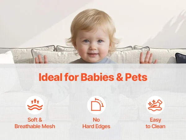 Secure Separation Without Blocking View: The retractable gate is crafted from high-strength baby-grade PVC mesh that's soft to the touch, breathable, and see-through, so you can monitor your baby or pet from a distance while creating a secure barrier