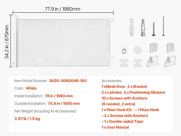 Escape-Proof Bottom Hook: Pets and toddlers love to explore—this retractable baby gate features a reinforced bottom hook that reduces crawling through and blocks dangerous bottom gaps. It's paired with high-strength mesh for long-lasting durability