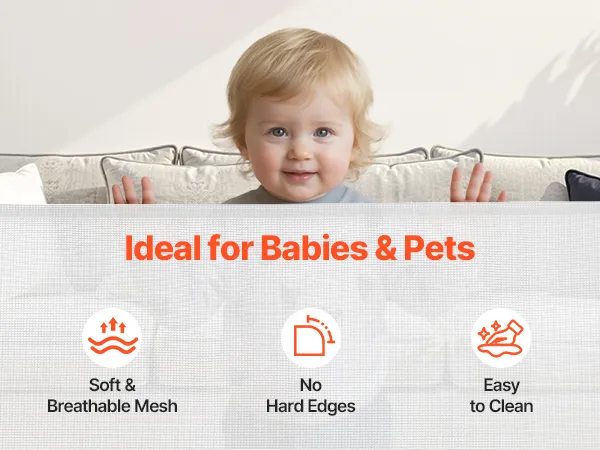 Secure Separation Without Blocking View: The retractable gate is crafted from high-strength baby-grade PVC mesh that's soft to the touch, breathable, and see-through, so you can monitor your baby or pet from a distance while creating a secure barrier