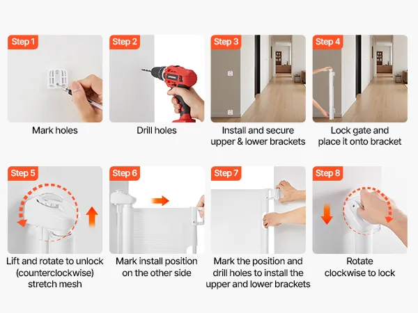 Damage-Free Baseboard Fit: Lower brackets can be adjusted vertically, allowing the retractable dog gate to be mounted over baseboards without damage. All hardware is included for quick and easy installation