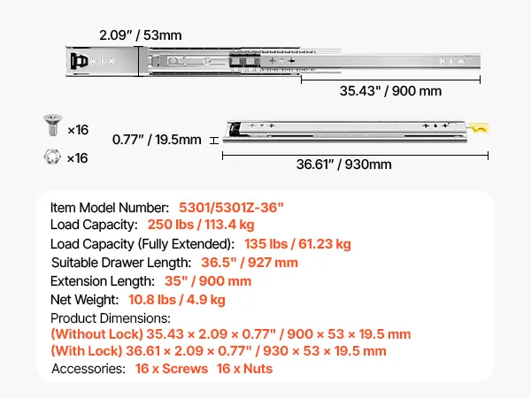 VEVOR 1 Pair Full Extension Drawer Slides 16 18 20 24 30 35 37.4 59 24 32 36 40 48 60 in, 250 lbs Load Capacity Locking Drawer Slides, Ball Bearing with Lock Side Mount Drawer Slide Rail VEVOR 1 Pair Full Extension Drawer Slides 16 18 20 24 30 35 37.4 59 24 32 36 40 48 60 in, 250 lbs Load Capacity Locking Drawer Slides, Ball Bearing with Lock Side Mount Drawer Slide Rail