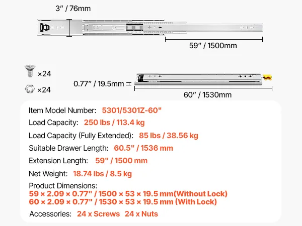 3-Fold Drawer Slides: You can get 1 pair of drawer slides with lock: 60 inches/1530 mm long, 2.09 inches/53 mm wide, 0.77 inches/19.5 mm thick. With 3-fold full extension design, you can reach the whole drawer. It is a good assistant for utilizing drawer space!