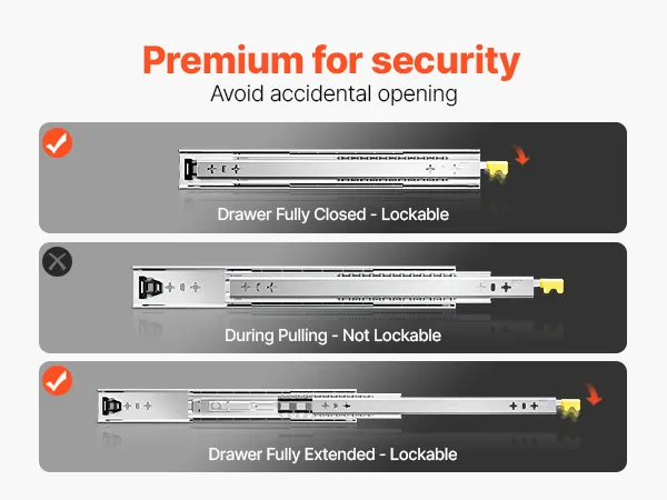 Secure Lock Design: The full extension dresser drawer slides are equipped with a locking design that locks the slides with a simple press, ensuring that your items are secure and won't slip off even in bumpy roads.