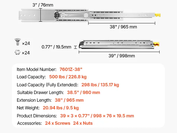 3-Fold Drawer Slides: You can get 1 pair of drawer slides: 39 inches/998 mm long, 3 inches/76 mm wide, 0.77 inches/19.5 mm thick. With 3-fold full extension design, you can reach the whole drawer. It is a good assistant for utilizing drawer space!