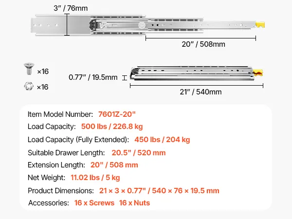 500lbs Heavy-Duty: Made of 0.77 in/19.5 mm thick high hardness steel, the heavy duty drawer slides have a weight capacity of up to 500 lbs. The galvanized finish makes the telescoping drawer slides rust and wear-resistant for long-time use. It can be used in shelving, cabinets, industrial drawers, RVs, trucks, vending machines and more.