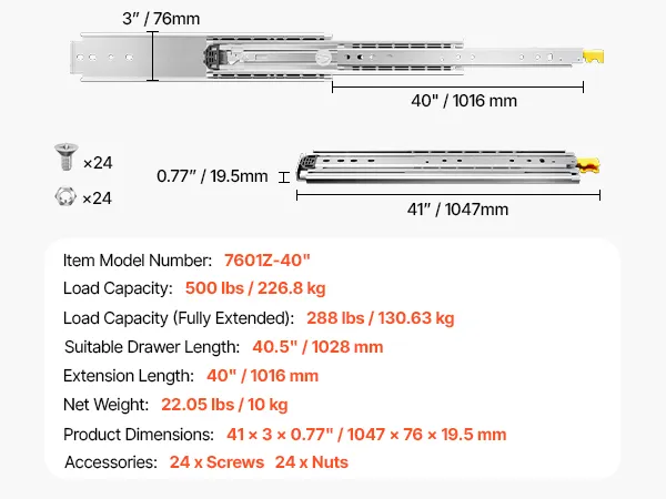With a 500 lbs load-bearing capacity, this drawer slides is made of high quality steel and it is rust and corrosion-resistant and built to last, meeting all your load-bearing needs.