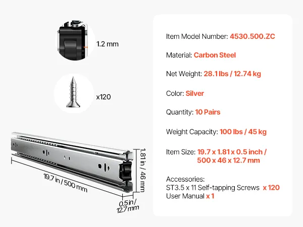 VEVOR Drawer Slides, 20 inch, 10 Pairs Full Extension Ball Bearing Cabinet Rails, 100 LB Load Capacity Heavy Duty Side Mount Dresser Drawer Slides, Drawer Track Runners for Kitchen DIY Replacement VEVOR Drawer Slides, 20 inch, 10 Pairs Full Extension Ball Bearing Cabinet Rails, 100 LB Load Capacity Heavy Duty Side Mount Dresser Drawer Slides, Drawer Track Runners for Kitchen DIY Replacement