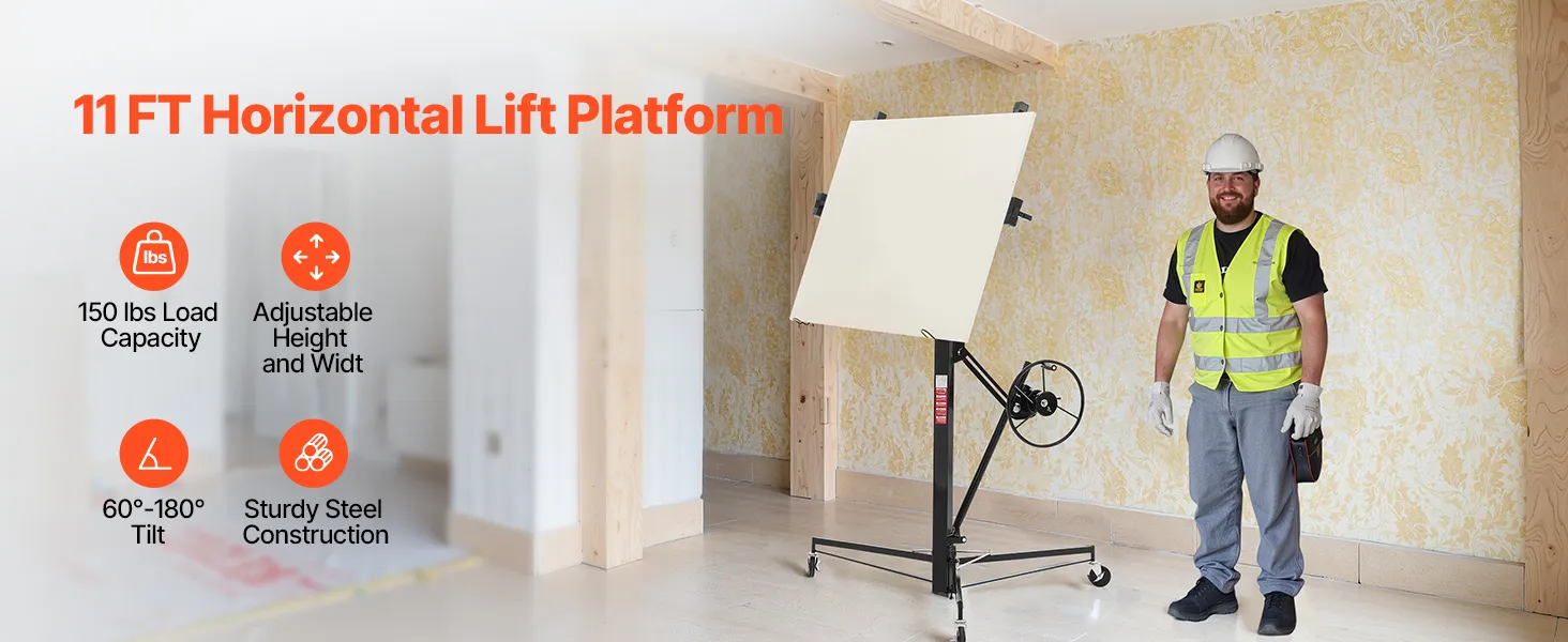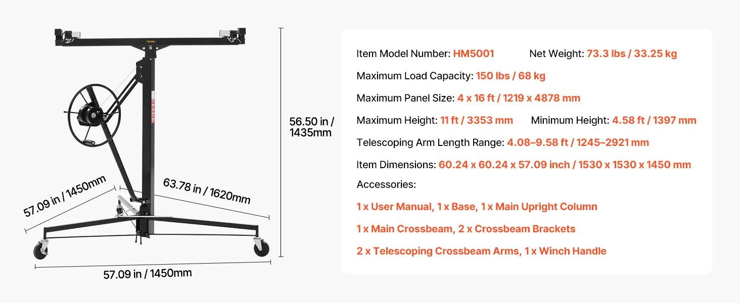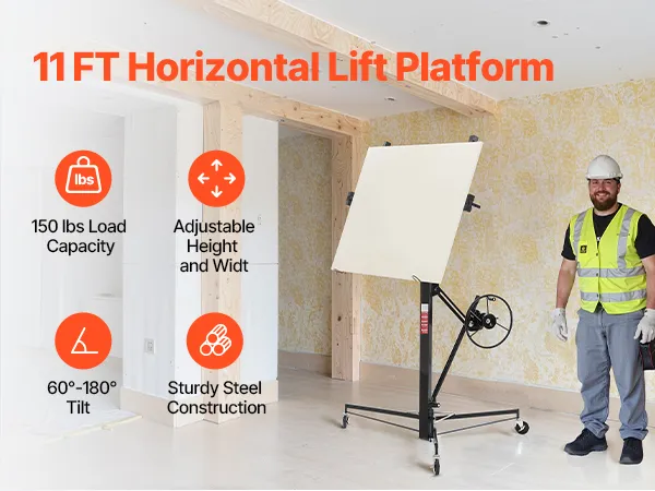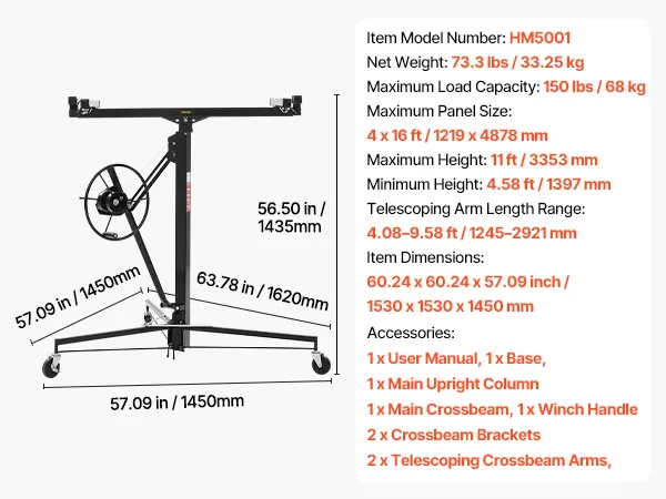 • Adjustable Height and Length: Telescoping Arm Length Range: 4.09–9.58 feet / 1245–2921 mm, making it ideal for panel installations. The sheetrock lift can reach a height of 11 feet / 3353 mm, helping you secure sheetrock to the ceiling