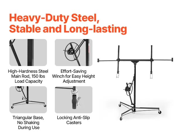 Assemble or disassemble in seconds without tools. Supports up to 150 lbs. Equipped with wheels and brakes for excellent stability and smooth mobility, making it ideal for easy ceiling and wall drywall installations.