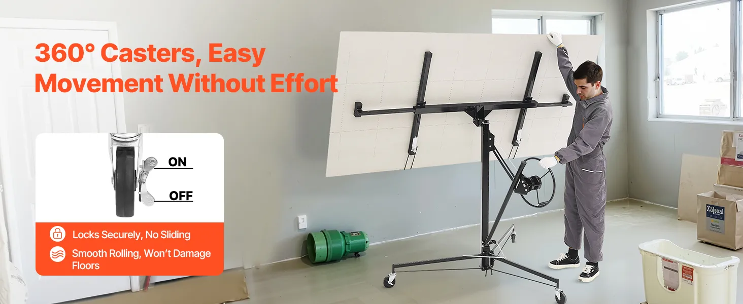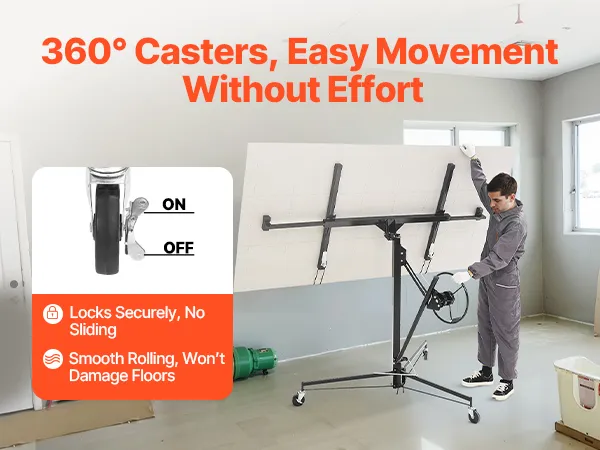 • Secure and Stable: The drywall panel lift is supported by a wide tripod base with 3 non-slip lockable wheels, ensuring stability and security during use. The lockable legs provide extra support, making the setup secure yet easy to move
