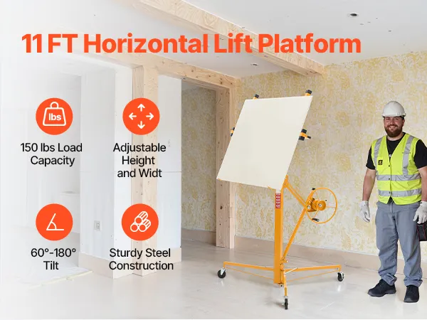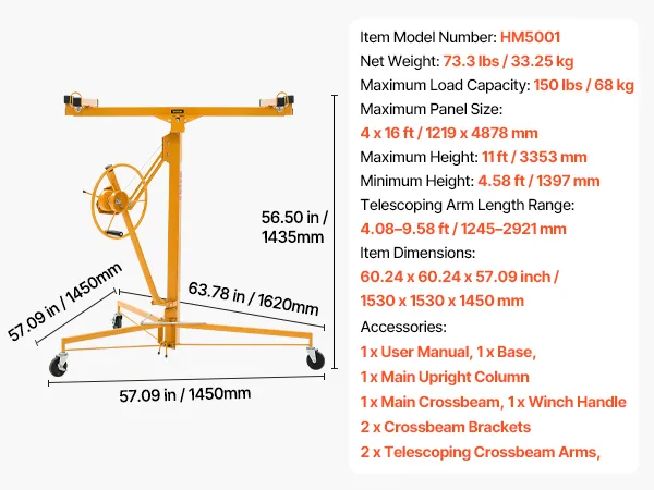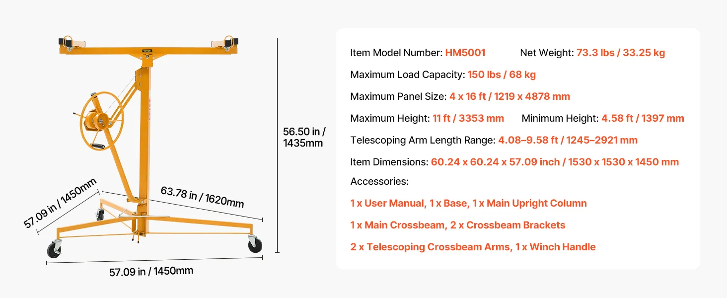 • Adjustable Height and Length: Telescoping Arm Length Range: 4.09–9.58 feet / 1245–2921 mm, making it ideal for panel installations. The sheetrock lift can reach a height of 11 feet / 3353 mm, helping you secure sheetrock to the ceiling