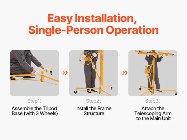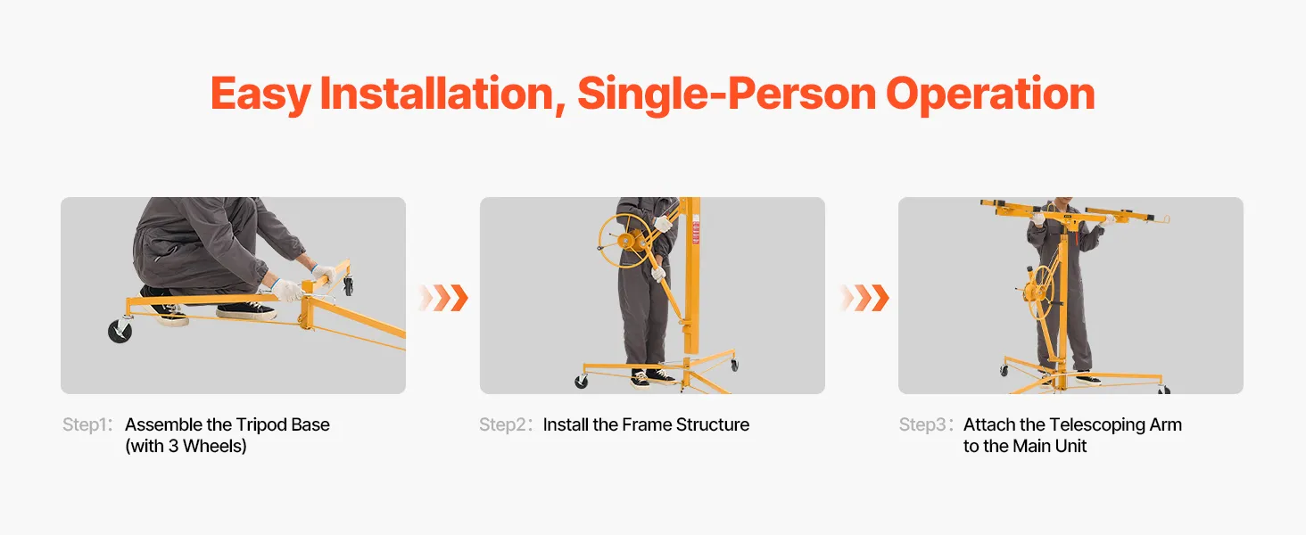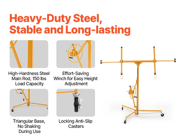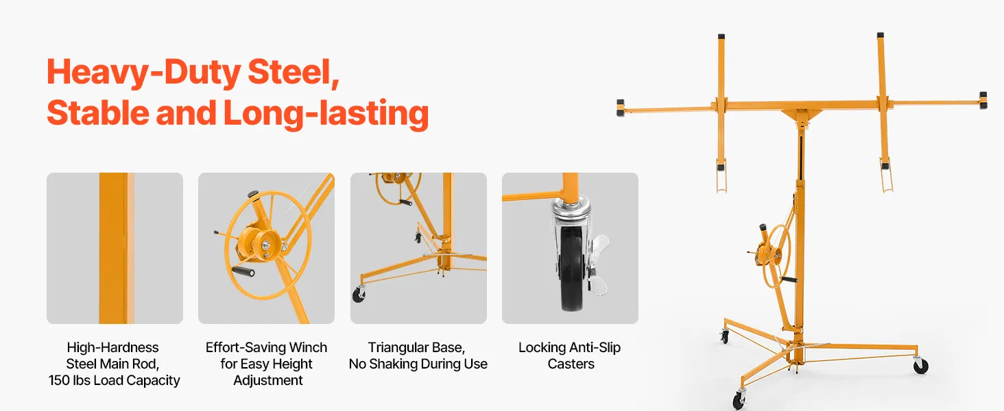 • Easy Assembly and Operation: This drywall jack can be easily assembled and disassembled without tools. It’s equipped with a winch to save manpower and is ideal for DIY and residential use, allowing one person to install drywall or wood panels