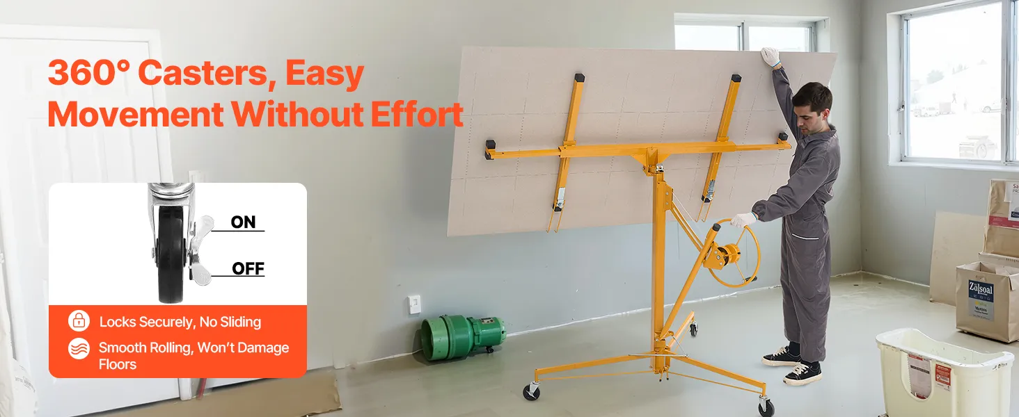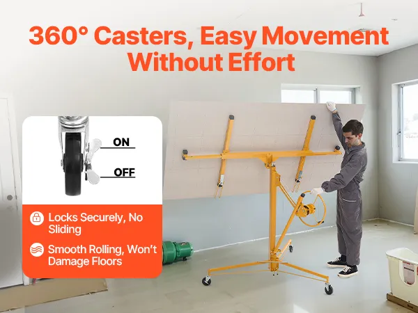 • Secure and Stable: The drywall panel lift is supported by a wide tripod base with 3 non-slip lockable wheels, ensuring stability and security during use. The lockable legs provide extra support, making the setup secure yet easy to move
