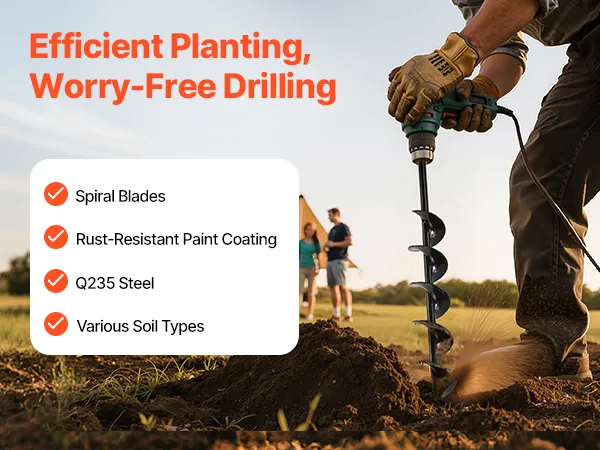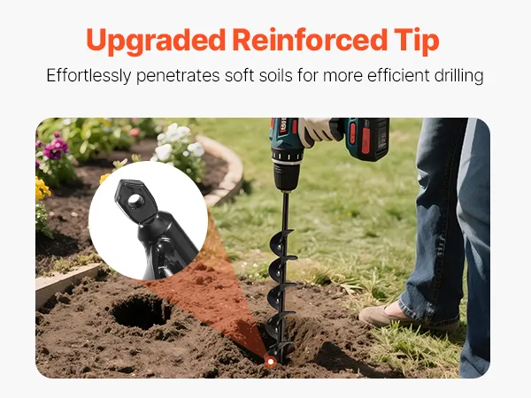Q: What type of drill is compatible with this auger bit?A: Most garden auger bits will fit into any 3/8" hex drive drill or 20mm ID drive drill, making them compatible with standard cordless or fuel drills. Make sure your drill bit has enough torque for efficient digging.Q: What soil types can this auger drill bit handle?A: This auger works well in loose to moderately compacted soil, including garden beds, clay, and sandy soil. However, for very rocky or hard-packed soil, a more powerful drill and extra effort may be needed.Q: What else can I use this auger drill bit for besides planting?A: In addition to digging holes for bulbs, flowers, and vegetables, you can also drill holes for small fence posts, tents, or outdoor decorations.