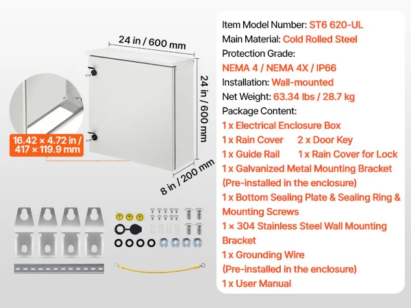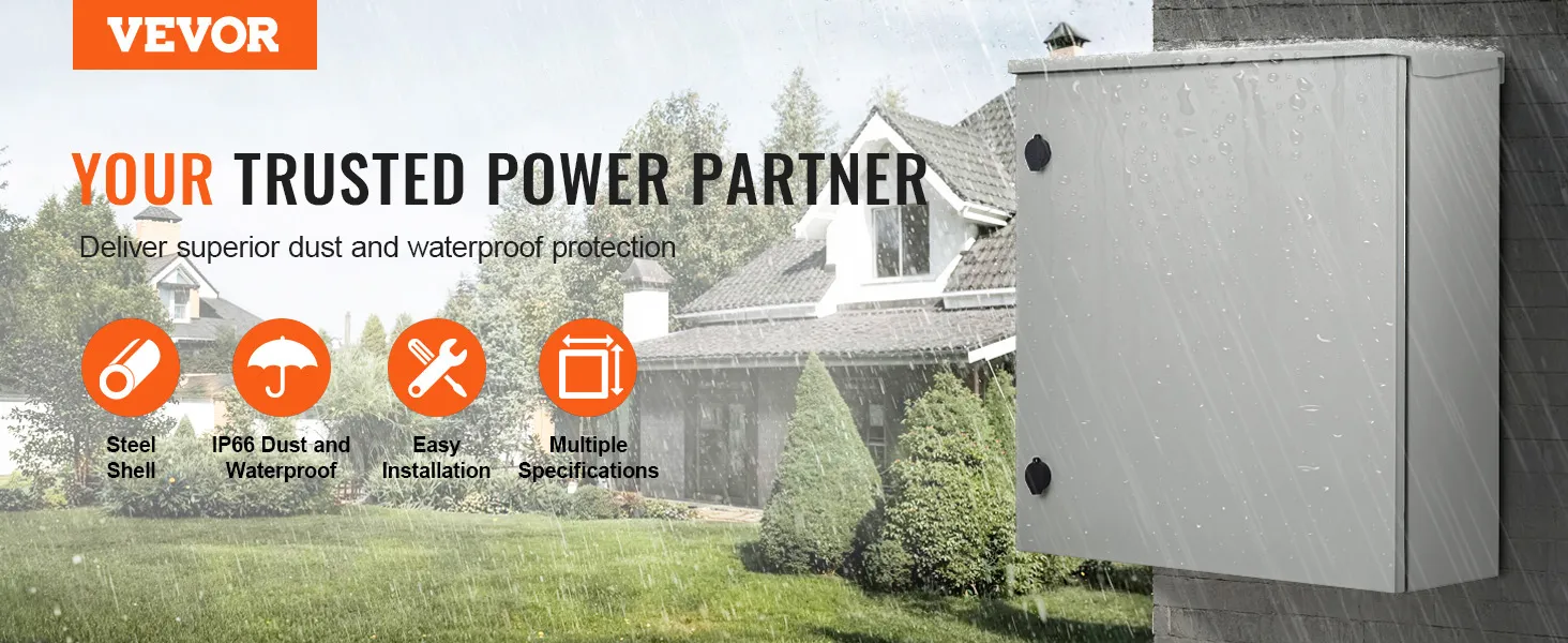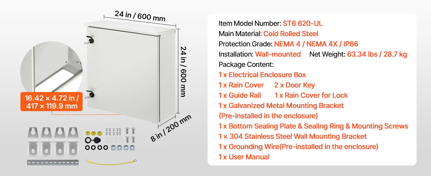 VEVOR Electrical Enclosure, 24x24x8in, Tested to UL Standards NEMA 4 Outdoor Enclosure, IP65 Waterproof & Dustproof Cold-Rolled Carbon Steel Hinged Junction Box for Outdoor Indoor Use, with Rain Hood VEVOR Electrical Enclosure, 24x24x8in, Tested to UL Standards NEMA 4 Outdoor Enclosure, IP65 Waterproof & Dustproof Cold-Rolled Carbon Steel Hinged Junction Box for Outdoor Indoor Use, with Rain Hood